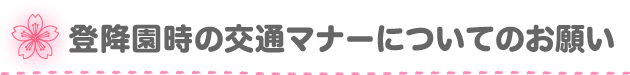 - 一人ひとりが気持ちよく登降園出来るようにマナーを守り、お互い譲り合いの気持ちをもって頂きます様ご協力よろしくお願い致します。(園に駐車できる台数は限られております。お迎え後は早めに車を出して次の方にお譲りください)